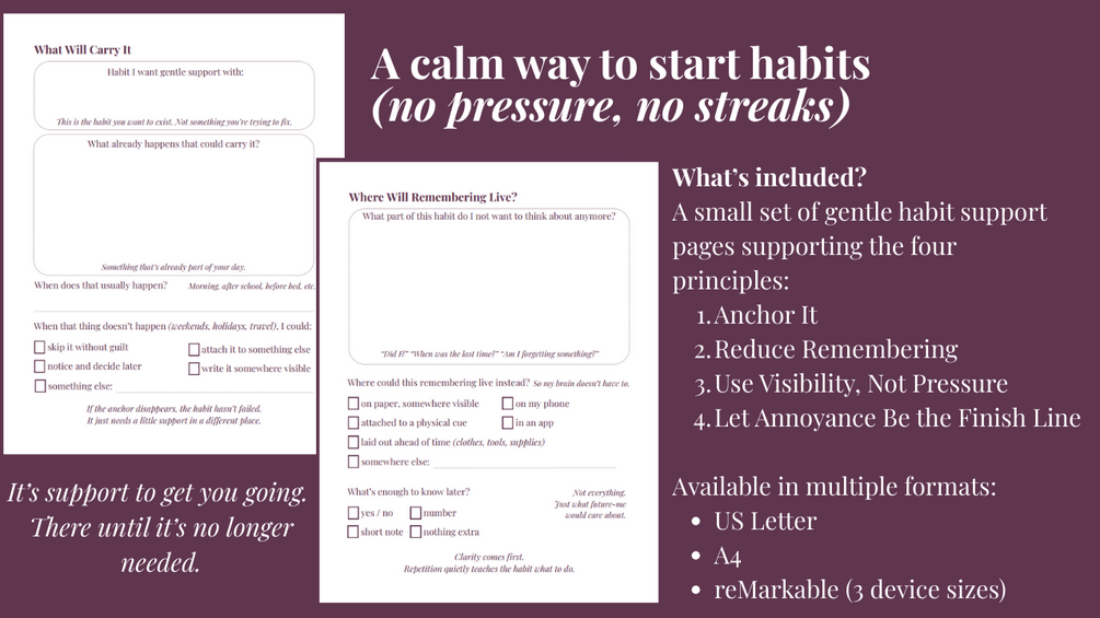 Gentle Habit Support is a small collection of printable pages designed to help a habit take root — and then step back once it no longer needs help.