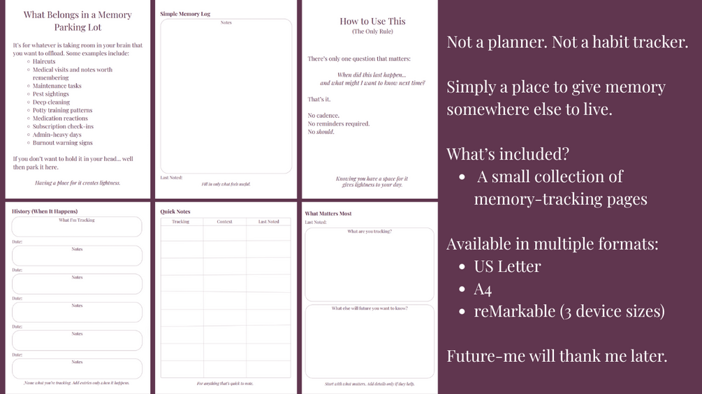 A gentle set of memory-tracking pages for things that don’t belong on a to-do list. No schedules, no streaks, no pressure. Simply a calm place to store what future-you might want to know later.
